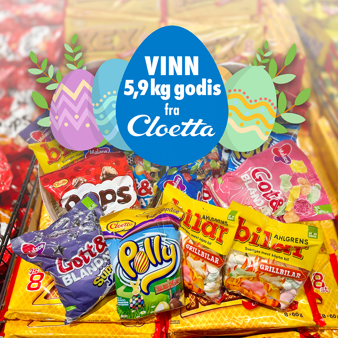 Sammen med Cloetta gir vi bort påskeegg med hele 5,9 kilo godis hver til tre heldige vinnere, med en herlig blanding av favoritter som får både store og små til å smile!